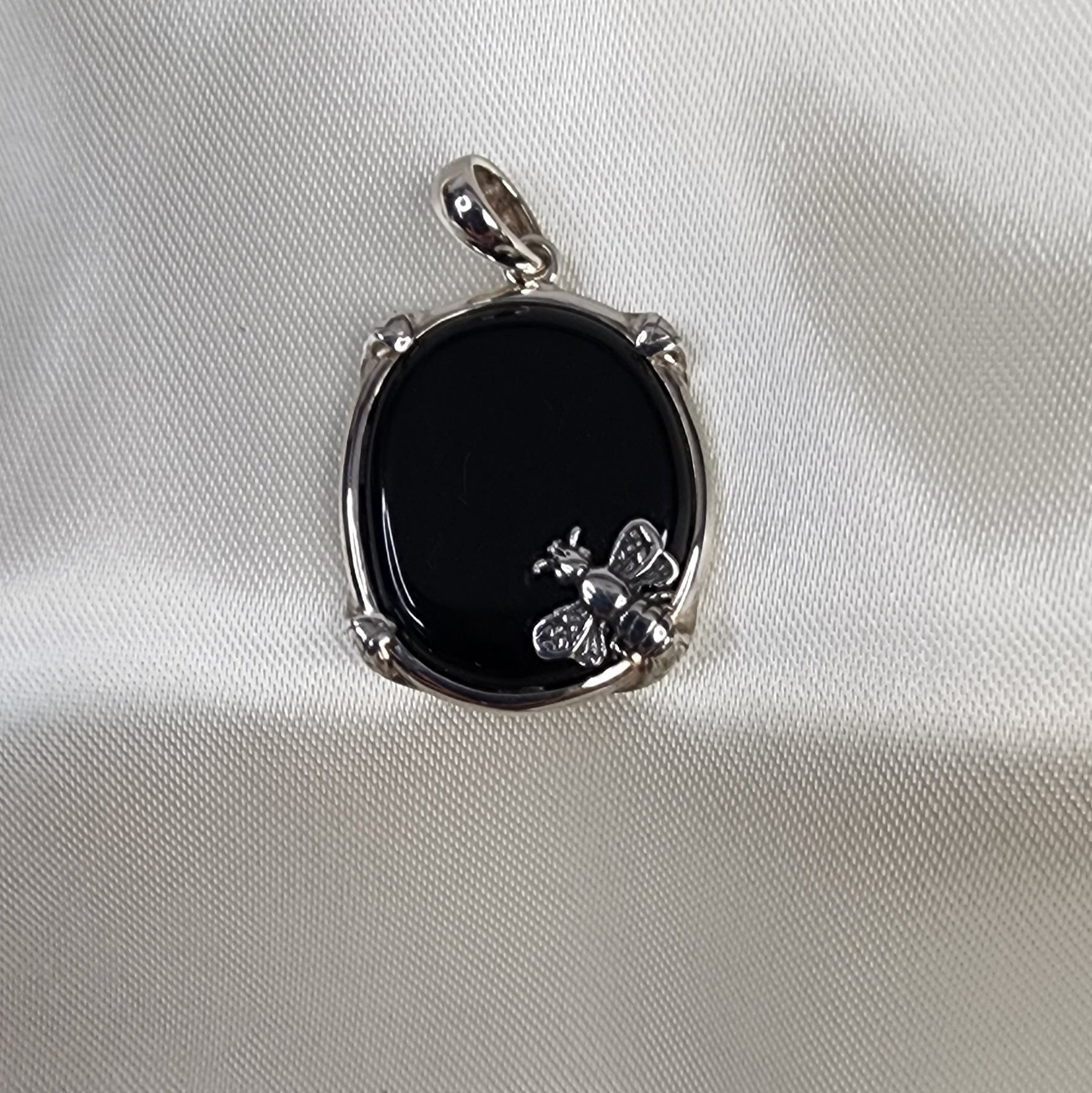 Black Onyx with a .925 silver wrap and a shiny silver bee. the perfect gift to give to the bee lover and gardner in your life. Bees are crucial for our eco-system and so are the humans who take care of them. Black Onyx protects against negative energies, promotes strength and self-control, is grounding and stabilizes the emotions. It brings emotional balance by helping to release fear and sorrow and opens the door to good fortune, and inner peace.