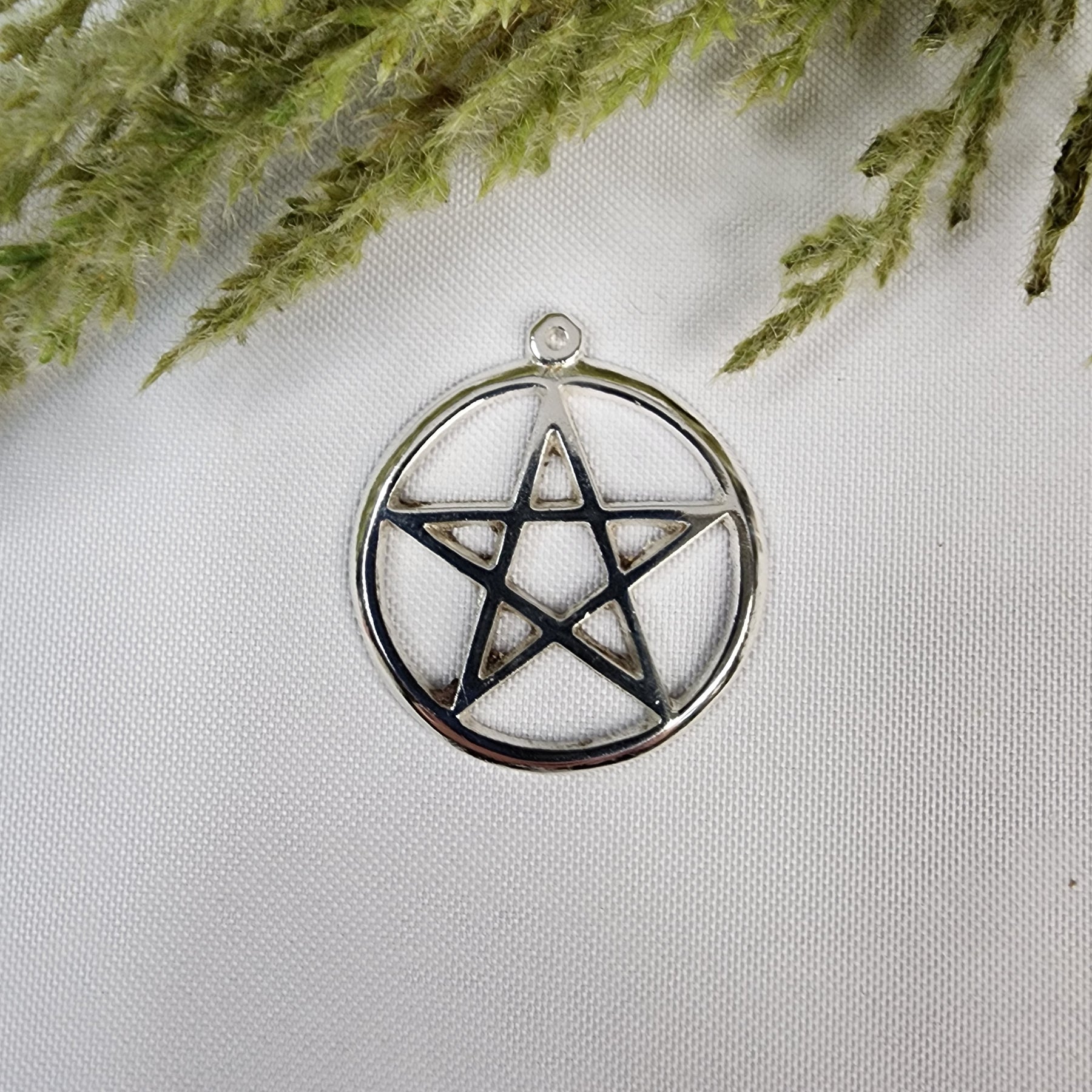 Pentacle within a circle pendant. Considered a talisman or magical object, it is a five-pointed star (a pentagram) enclosed within a circle, often used to represent the five elements of earth, air, fire, water, and spirit, and for protection. This metal pentacle is silver in color and approximately 1.5" dia and comes on a black cord.