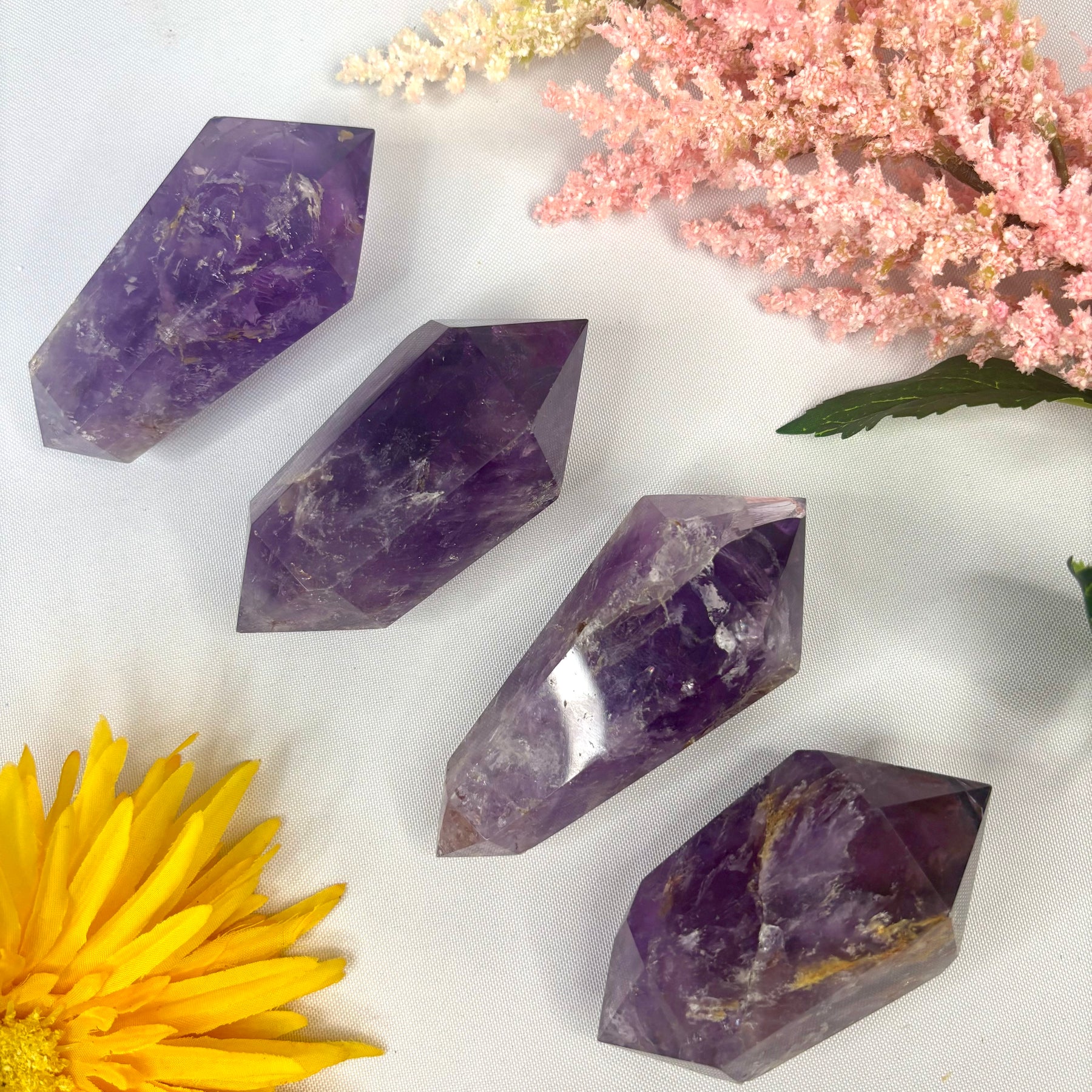 Amethyst Double Terminated Point is an excellent stone to meditate with. Known for strengthening your connection to Divine energy, it is used to open and enhance psychic abilities. It is a healing stone, purifying and helps to rid the mind of negative emotions and thoughts. It is used for spiritual wisdom and is a stone of sobriety. Chakras: Third Eye/6th, Crown/7th  Element:  Wind